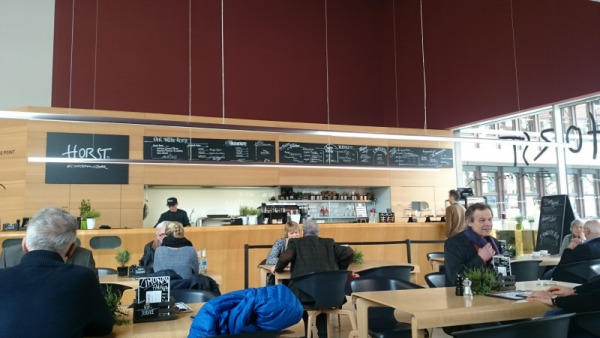 Die Gäste trinken hier zur Nachbesprechung der Ausstellung einen Kaffee, sie kommen aus den umliegenden Firmen zum Mittagessen oder strömen aus den anderen Institutionen im Museumsviertel für ein Stück Kuchen hierher. Denn Horst hat wirklich Charme. Gemeint ist das Lokal, nicht der Ministerpräsident.